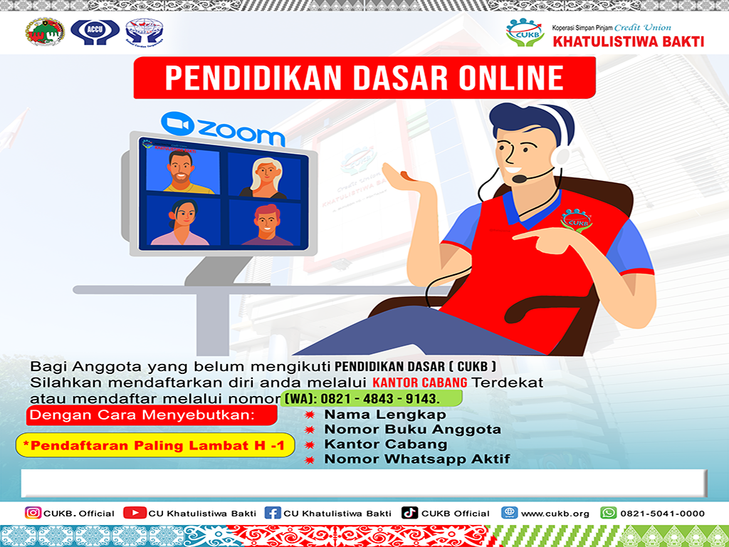 Kegiatan Pendidikan Dasar (PD) di selenggarakan secara online maupun offline, pesertanya adalah anggota yang baru masuk bergabung di CU Khatulistiwa Bakti.