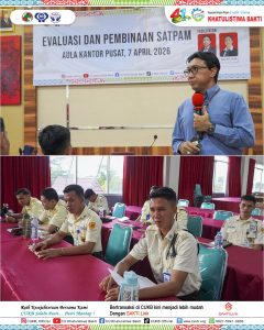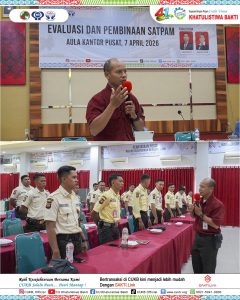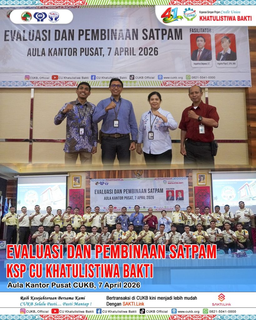 Kegiatan evaluasi dan pembinaan Satuan Pengamanan (Satpam) dilaksanakan pada tanggal 7 April 2026 bertempat di Aula Kantor Pusat CUKB. Kegiatan ini diikuti oleh seluruh personel satpam yang bertugas baik di Kantor Pusat maupun di seluruh Kantor Cabang KSP CU Khatulistiwa Bakti. Pelaksanaan kegiatan ini bertujuan untuk meningkatkan kualitas kinerja, kedisiplinan, serta profesionalisme satpam dalam menjalankan tugas pengamanan dan pelayanan kepada anggota maupun masyarakat.