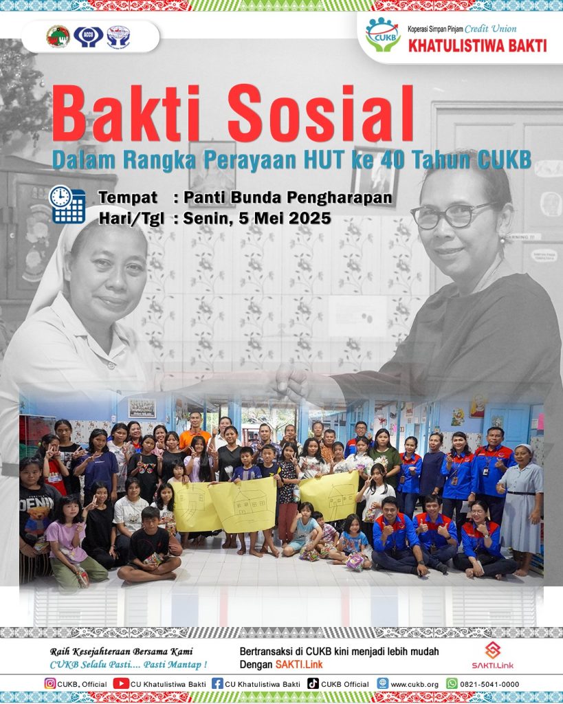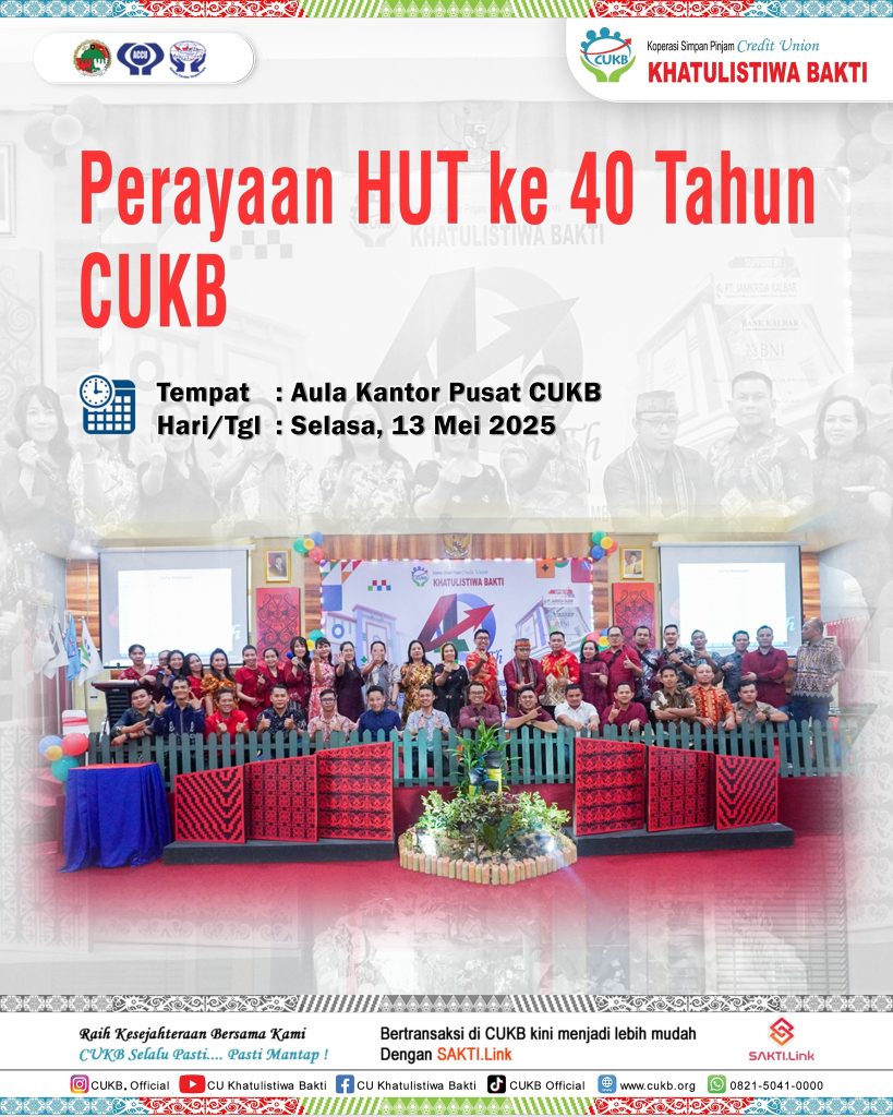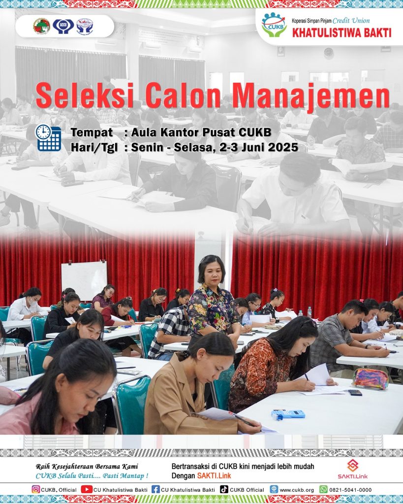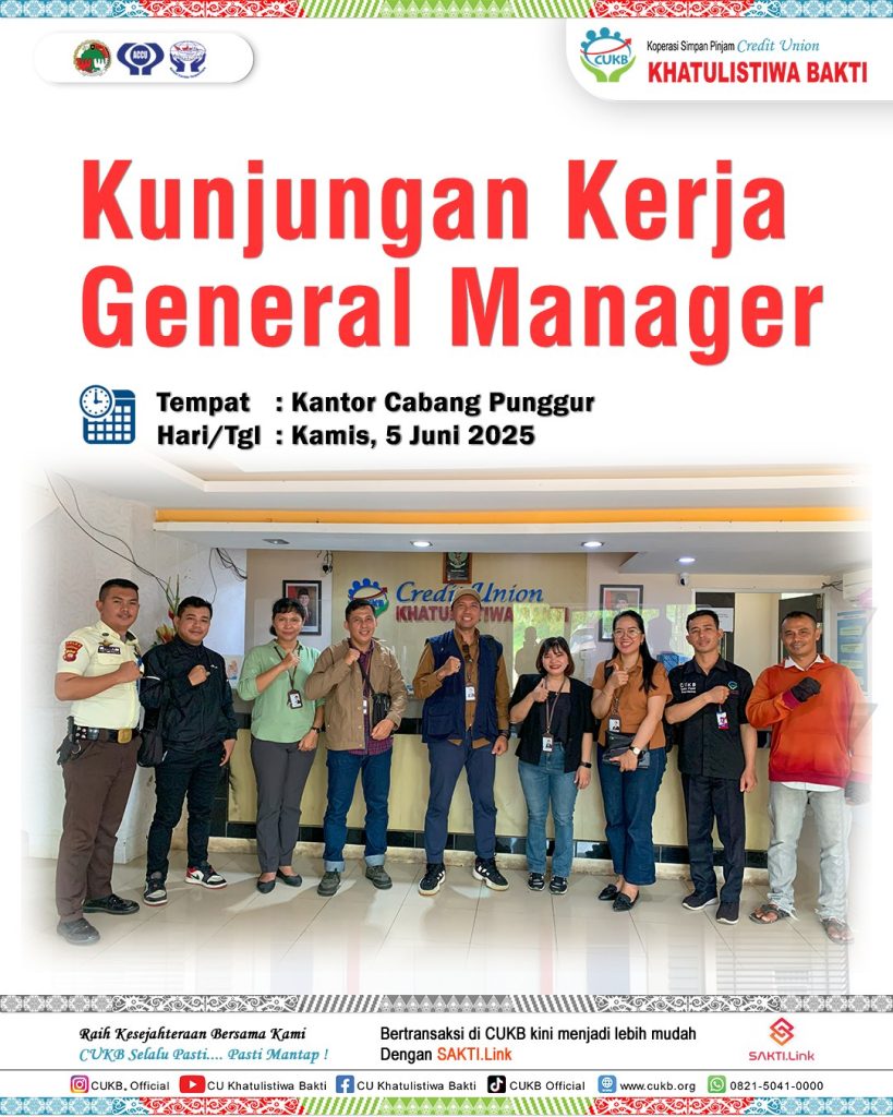 Jadwal Pendidikan Dasar Credit Union Khatulistiwa Bakti Juni 2025 Tempat Pelayanan : Kantor Cabang Sebangki Tanggal Kegiatan : Senin, 09 Juni 2025 Fasilitator : Roymundus Martin, S.E. Tempat Pelaksanaan : Dusun Sindur Desa Agak Kec Sebangki Tempat Pelayanan : Kantor Cabang Sekilap Tanggal Kegiatan : Senin, 09 Juni 2025 Fasilitator : Marjuki Tempat Pelaksanaan : Mandor Tempat Pelayanan : Kantor Cabang Terentang Tanggal Kegiatan : Selasa, 10 Juni 2025 Fasilitator : Yosef Tempat Pelaksanaan : Aula KC Terentang Tempat Pelayanan : Kantor Cabang Teluk Pakedai Tanggal Kegiatan : Rabu, 11 Juni 2025 Fasilitator : Marsius, S.P. Tempat Pelaksanan : Aula KC Teluk Pakedai Tempat Pelayanan : Kantor Cabang Kuala Behe Tanggal Kegiatan : Kamis, 12 Juni 2025 Fasilitator : Heryadi, S.H. Tempat Pelaksanan : Jambu Balai Tempat Pelayanan : Kantor Cabang Tayan Tanggal Kegiatan : Kamis, 12 Juni 2025 Fasilitator : Anong, A.Md. Tempat Pelaksanan : Jeramun Tempat Pelayanan : Kantor Cabang Ngabang Tanggal Kegiatan : Jumat, 13 Juni 2025 Fasilitator : Jonosius, S.Kom. Tempat Pelaksanan : Adong 1 Tempat Pelayanan : Kantor Cabang Kubu Tanggal Kegiatan : Jumat, 13 Juni 2025 Fasilitator : Doren, S.P. Tempat Pelaksanan : Dusun Parit Sembilan Desa Ambawang Tempat Pelayanan : Kantor Cabang Anjongan Tanggal Kegiatan : Jumat, 13 Juni 2025 Fasilitator : Rosalina S., S.S.Ing. Tempat Pelaksanaan : Aula KC Anjongan Tempat Pelayanan : Kantor Cabang Singkawang Tanggal Kegiatan : Rabu, 18 Juni 2025 Fasilitator : Aminto, S.E. Tempat Pelaksanaan : Kelurahan Pajintan Tempat Pelayanan : Kantor Cabang Senakin Tanggal Kegiatan : Jumat, 20 Juni 2025 Fasilitator : Teresia Edarwati, S.E. Tempat Pelaksanaan : Aula KC Senakin Tempat Pelayanan : Kantor Cabang Padang Tikar Tanggal Kegiatan : Jumat, 20 Juni 2025 Fasilitator : Sylvester Denny Tempat Pelaksanaan : Desa Ambarawa Tempat Pelayanan : Kantor Cabang Tanjung Hulu Tanggal Kegiatan : Jumat, 20 Juni 2025 Fasilitator : Markus Sugito, S.E. Tempat Pelaksanaan : Ruang Diklat KC Tanjung Hulu Tempat Pelayanan : Kantor Cabang Batang Tarang Tanggal Kegiatan : Jumat, 20 Juni 2025 Fasilitator : Yustinus Anson, S.H. Tempat Pelaksanaan : Peruan Dalam Tempat Pelayanan : Kantor Cabang Balai Kota Tanggal Kegiatan : Sabtu, 21 Juni 2025 Fasilitator : Meinardus Nasir, S.E. Tempat Pelaksanaan : Aula Kantor Pusat Tempat Pelayanan : Kantor Cabang Teluk Batang Tanggal Kegiatan : Sabtu, 21 Juni 2025 Fasilitator : Hendrikus Tempat Pelaksanaan : Aula KC Teluk Batang Bagi anggota yang mau mengikuti Pendidikan Dasar silahkan menghubungi kantor Cabang atau WhatApp(WA) ke 0821-4843-91-43 dengan menyebutkan, Nama, Nomor buku Anggota, Kantor Cabang. Bagi Peserta yang mengikuti sampai selesai akan mendapatkan sertifikat . Demikian pengumuman ini di samapaikan atas perhatiaannya kami ucapkan terima kasih.
