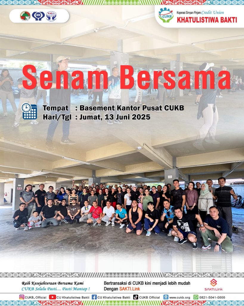 Basement Kantor Pusat CUKB, 13 Juni 2025 Pada hari Jumat, 13 Juni 2025, KSP CU Khatulistiwa Bakti menggelar kegiatan Senam Bersama dengan instruktur senam professional yang berlangsung meriah di area basement Kantor Pusat. Kegiatan ini diikuti oleh para aktivis CUKB, anggota, Istimewa dari Karyawan Bank Kalbar Cabang Flamboyan. Senam bersama ini tidak hanya menjadi ajang untuk menjaga kebugaran dan kesehatan, tetapi juga mempererat tali silaturahmi antar sesama insan Credit Union dan mitra kerja. Dengan semangat kebersamaan, seluruh peserta mengikuti gerakan demi gerakan senam dengan antusias dan penuh semangat. Kegiatan ini menjadi bagian dari upaya KSP CU Khatulistiwa Bakti dalam membangun budaya hidup sehat di lingkungan kerja, serta memperkuat kolaborasi lintas lembaga dalam suasana yang santai dan menyenangkan. Terima kasih kepada semua pihak yang telah berpartisipasi. Semoga semangat sehat dan kebersamaan ini terus terjaga dan menjadi budaya positif di lingkungan KSP CU Khatulistiwa Bakti.