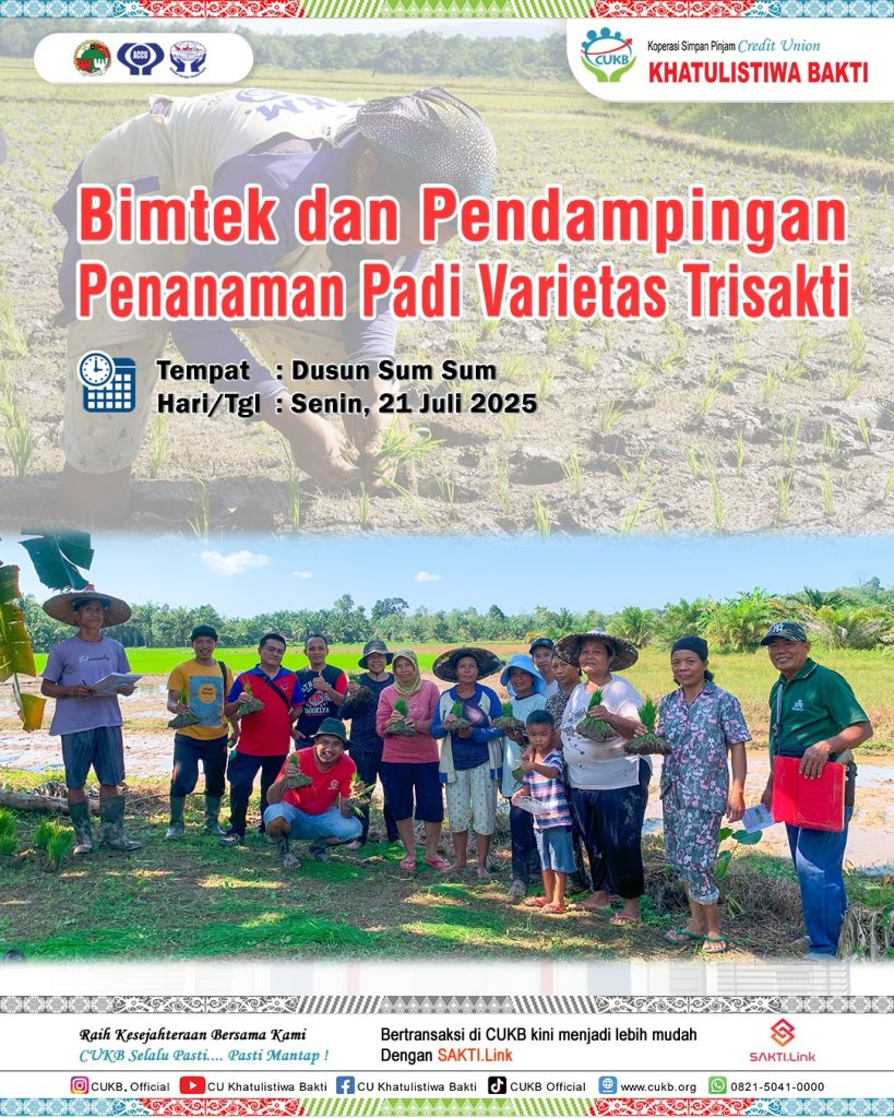 Dusun Sumsum, 21 Juli 2025 Pada tanggal 21 Juli 2025, telah dilaksanakan kegiatan Bimbingan Teknis (Bimtek) dan Pendampingan Penanaman Padi Varietas Trisakti di Dusun Sumsum, Desa Sumsum, Kecamatan Mandor, Kabupaten Landak. Kegiatan ini diselenggarakan oleh Bidang Pemberdayaan Kantor Pusat KSP CU Khatulistiwa Bakti sebagai bentuk nyata komitmen dalam mendukung ketahanan pangan dan peningkatan kesejahteraan anggota. Dalam kesempatan ini, CU Khatulistiwa Bakti menghadirkan narasumber Ibu Emilia Farida Budi Handayani, S.P., M.M., yang juga merupakan dosen di Politeknik Tonggak Equator (POLTEQ). Beliau memberikan materi secara langsung mengenai teknik penanaman dan perawatan padi Varietas Trisakti kepada kelompok pemberdayaan CU Khatulistiwa Bakti Kantor Cabang Sekilap. Materi yang disampaikan mencakup tahapan persiapan lahan, teknik tanam, pemupukan, pengendalian hama, serta strategi panen yang optimal. Kegiatan ini turut dihadiri oleh Albertus Yudiantono, S.E., selaku Manager Kantor Cabang Sekilap, dan Sukaran, selaku Komite Pemberdayaan Kantor Cabang. Kehadiran mereka memberikan semangat dan dukungan penuh kepada kelompok pemberdayaan untuk terus mengembangkan kemampuan dan kemandirian di sektor pertanian. Melalui kegiatan ini, diharapkan para anggota kelompok mampu menerapkan pengetahuan yang diperoleh dalam praktik nyata serta menjadi pelopor dalam pengembangan varietas padi unggul di wilayahnya.