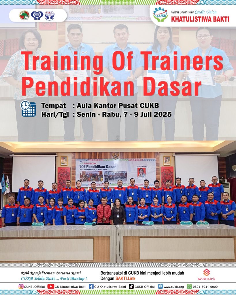 Aula Kantor Pusat CUKB, 7-9 Juli 2025 Pada tanggal 7-9 Juli 2025, telah dilaksanakan kegiatan Training of Trainers (TOT) Pendidikan Dasar di Aula Kantor Pusat KSP CU Khatulistiwa Bakti. Kegiatan ini dibuka secara resmi oleh Sekretaris Pengurus, Bapak Amir, S.Pd., yang dalam sambutannya menyampaikan pentingnya penguatan kapasitas internal dalam mendukung pengembangan pendidikan anggota. Kegiatan TOT ini menghadirkan fasilitator utama Dr. Sesilia Seli, M.Pd., serta tim asesor yang terdiri dari Kornelia, S.E., Tobias, S.Ak., dan Elisabeth Elia L.S., S.E. Materi yang disampaikan mencakup pemahaman mendalam mengenai konsep Pendidikan Dasar dalam Gerakan Credit Union, metode fasilitasi yang efektif, serta teknik evaluasi pembelajaran. Training of Trainers adalah program pelatihan yang bertujuan untuk mempersiapkan individu menjadi pelatih (trainer) yang efektif dan mampu menyampaikan materi pelatihan dengan baik kepada orang lain. Singkatnya adalah pelatihan untuk melatih para pelatih. TOT Pendidikan Dasar ini diikuti oleh seluruh manajemen Kantor Cabang CUKB. Setiap peserta mendapatkan kesempatan untuk melakukan presentasi sebagai bagian dari praktik fasilitasi dan penilaian keterampilan penyampaian materi. Antusiasme peserta tampak tinggi sepanjang kegiatan, ditandai dengan diskusi yang aktif dan semangat dalam mengembangkan pendekatan pembelajaran yang lebih partisipatif dan memberdayakan.Kegiatan ini ditutup secara resmi oleh Bapak Amir, S.Pd., yang menyampaikan apresiasi kepada seluruh fasilitator, asesor, dan peserta atas kontribusi aktif selama kegiatan berlangsung. Diharapkan, hasil dari TOT ini dapat meningkatkan kualitas pendidikan anggota di seluruh wilayah layanan KSP CU Khatulistiwa Bakti.