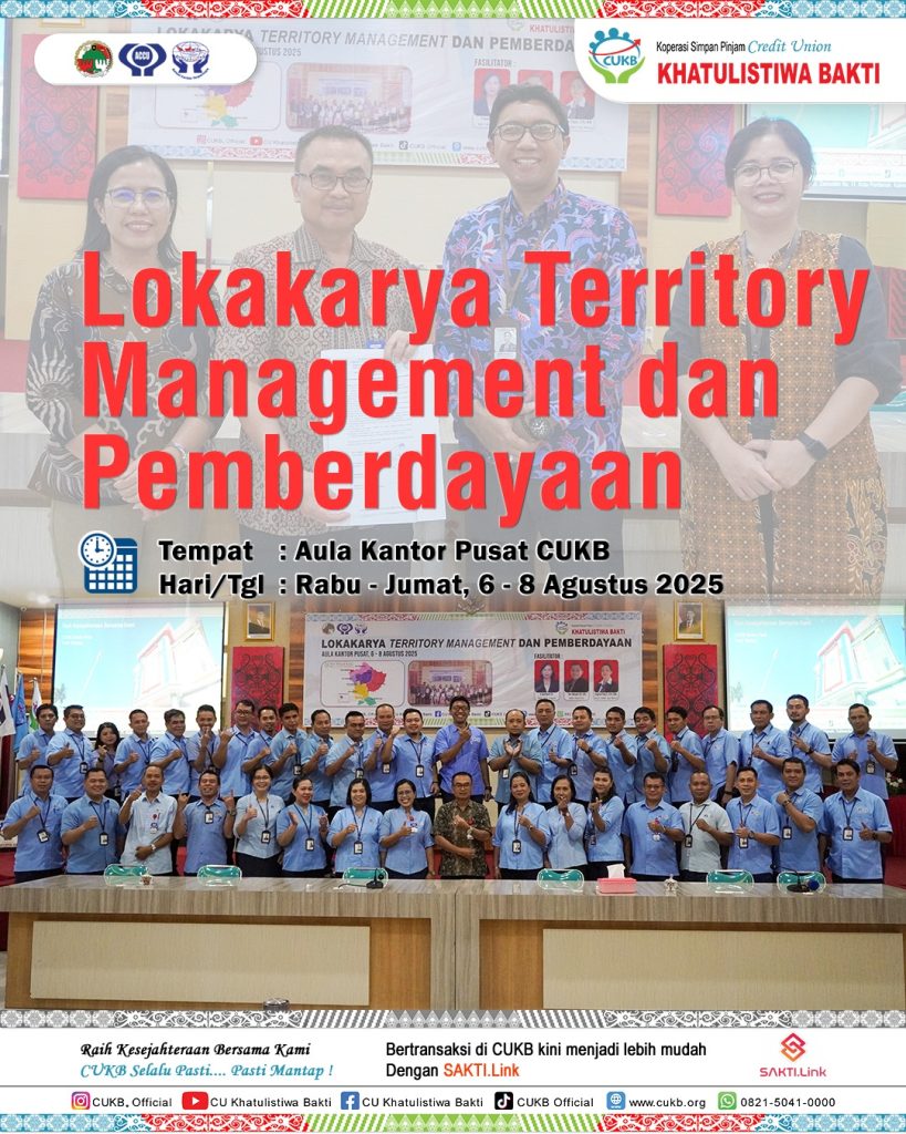 Aula Kantor Pusat CUKB, Rabu-Jumat 6 – 8 Agustus 2025 KSP CU Khatulistiwa Bakti menyelenggarakan Lokakarya Territory Management dan Pemberdayaan pada tanggal 6–8 Agustus 2025, bertempat di Aula Kantor Pusat CUKB. Kegiatan ini diikuti oleh Penasihat, Pengurus, Pengawas, General Manager, Deputi, serta Manager dari 28 Kantor Cabang. Acara dibuka secara resmi oleh Amir, S.Pd., selaku Sekretaris Pengurus. Fasilitator dalam kegiatan ini adalah V. Budi Astuti, S.H., Angelina Filipa E., S.Pd., M.M., dan Zeno Wahyudi Dwi Harsono, S.Ak. Lokakarya ini merupakan bagian dari rencana kerja strategis untuk mengembangkan wilayah pelayanan CU Khatulistiwa Bakti di masa mendatang. Dalam kegiatan ini, manajer dari 28 kantor cabang mempresentasikan wilayah kerja masing-masing sekaligus membahas tantangan serta strategi pengembangannya. Selain itu, peserta mendapatkan materi mengenai pentingnya pemberdayaan sebagai pilar utama dalam memajukan CU Khatulistiwa Bakti. Kegiatan diakhiri dengan penandatanganan berita acara dan ditutup secara resmi oleh Amir, S.Pd., Sekretaris Pengurus. Harapannya, melalui kegiatan ini, kinerja organisasi semakin meningkat dan wilayah pengembangan semakin luas sehingga pelayanan kepada anggota tetap optimal.